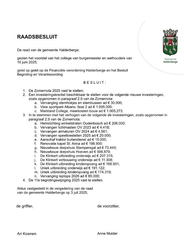 De raad van de gemeente Halderberge heeft op 3 juli ingestemd met de zomernota 2025. Er is ingestemd met het ophogen van het budget voor de investeringen voor de verbouwing en uitbreiding van De Klinkert zoals beschreven in paragraaf 2.9.