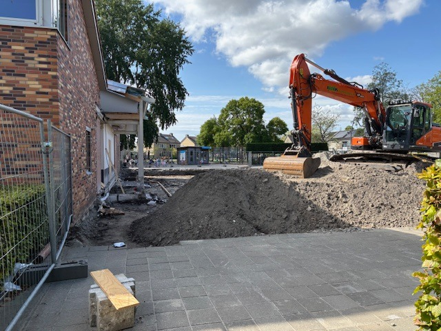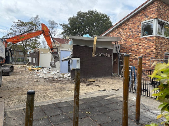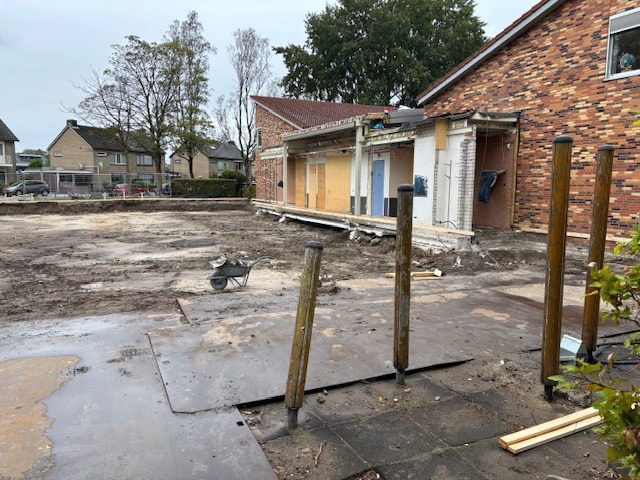 De sloopwerkzaamheden zijn voorlopig afgerond, zowel de westkant als de oostkant is verwijderd. Tijd om te starten met de voorbereidende grondwerkzaamheden. De bouwkeet is met een tijdelijke verbinding aangesloten op de riolering.