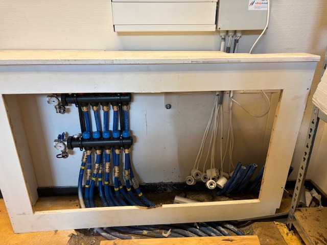 Niet alleen buiten vinden er werkzaamheden plaats, ook binnen worden er aanpassingen gedaan als voorbereiding op de nieuwe aanbouw. Op een van de foto's hieronder is te zien dat de sloop van buiten ook binnen z'n sporen achter laat. De vloerverwarming van een gesloopt deel wordt verwijderd waarna een nieuwe verdeler wordt geplaatst.